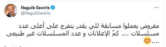 وكتب نجيب ساويرس تغريدة على تويتر قال فيها: "مفروض يعملوا مسابقة للي يقدر يتفرج على أعلى عدد مسلسلات. كمً الإعلانات وعدد المسلسلات غير طبيعي".