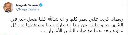 وكان ساويرس هنأ متابعيه والمصريين ومصر كلها بحلول شهر رمضان في تغريدة قال فيها: "رمضان كريم على مصر كلها وإن شاء الله كلنا نعمل خير في الشهر ده ونطلب من ربنا ان يبارك بلدنا ويحفظها من كل سوء ويبعد عننا مؤامرات الناس الأشرار".