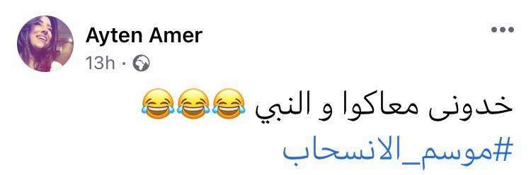 عامر على حسابها عبر فيس بوك :" موسم الانسحاب خودوني معاكم والنبي .