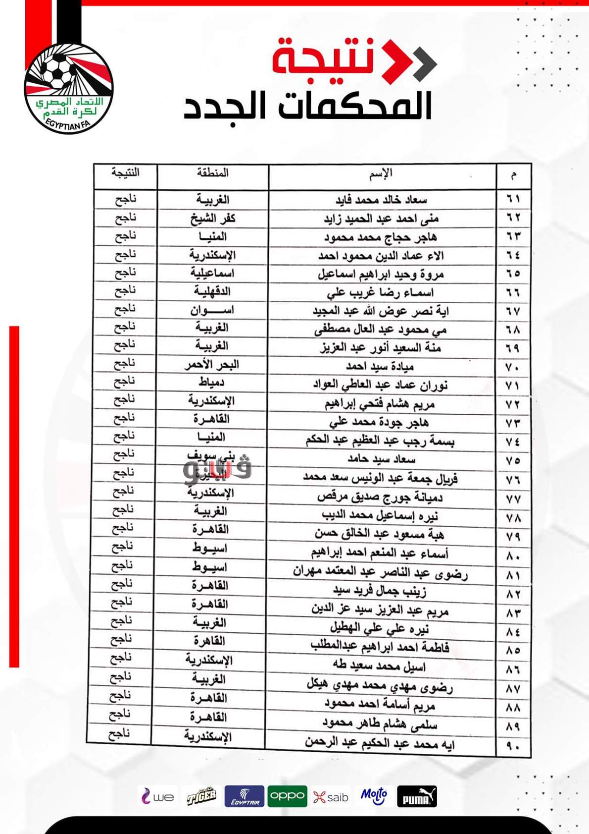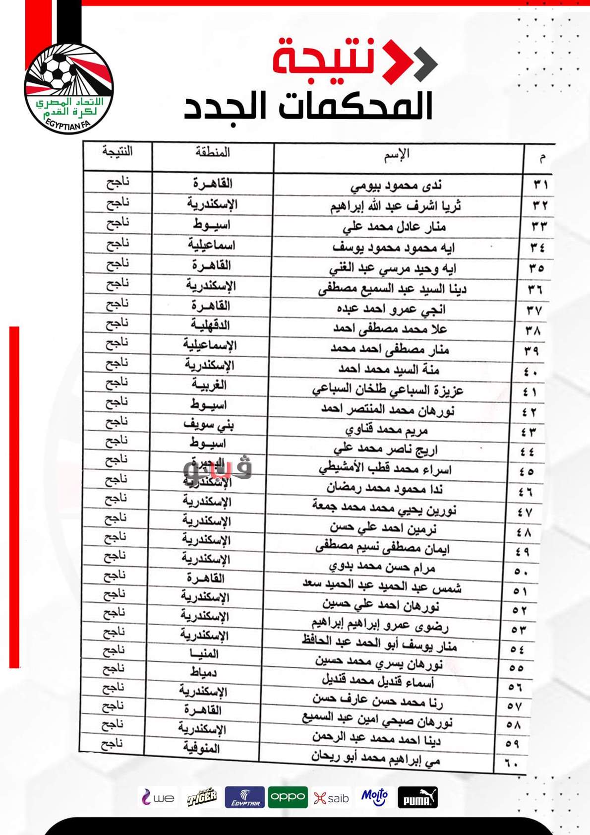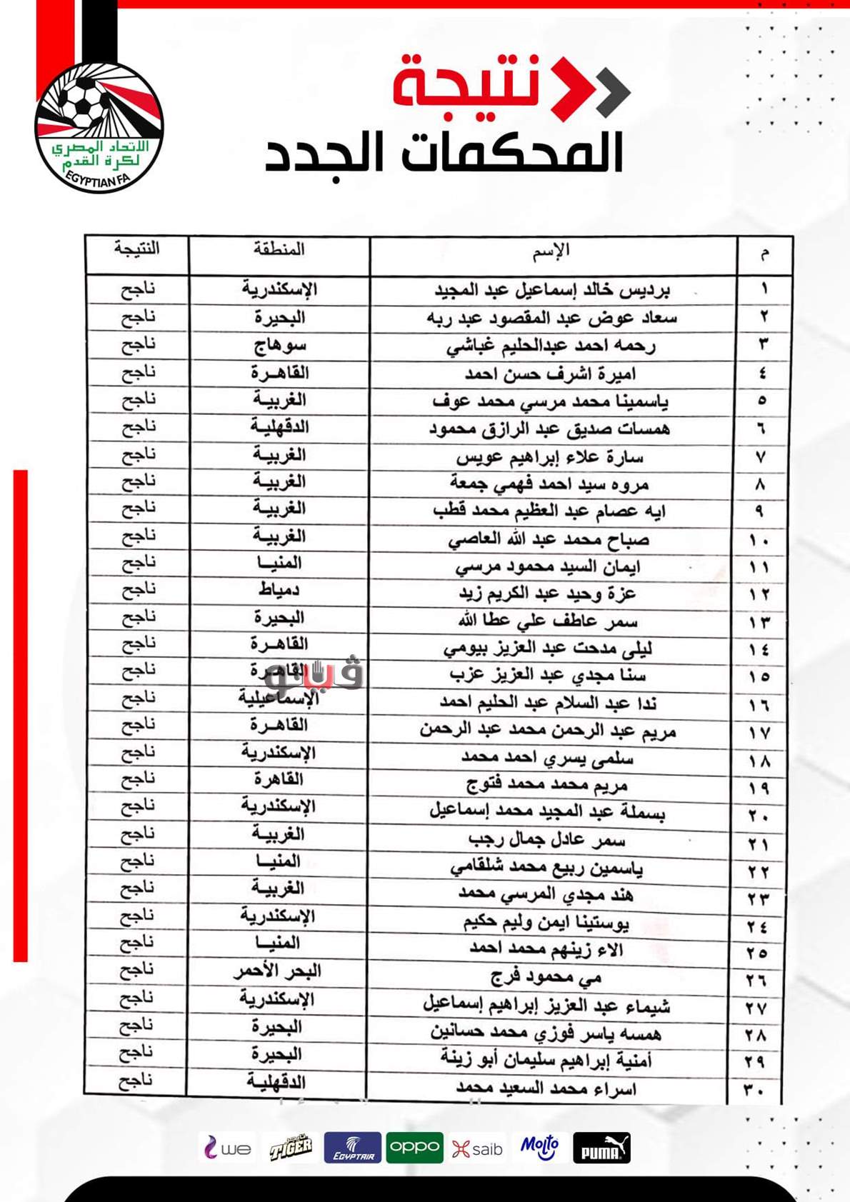 أعلنت لجنة الحكام الرئيسية بالاتحاد المصري لكرة القدم نتيجة اختبارات المحكمات الجدد بنجاح 131 محكمة جديدة من بين 174 تقدمن للاختبار التي أجريت خلال الفترة الماضية.