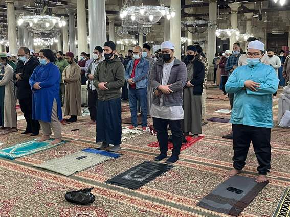 جموع غفيرة تتضرع لربها بالدعاء في هذه الليلة الروحانية التي يجتمع فيها الآلاف لأداء صلوات التراويح داخل المسجد.