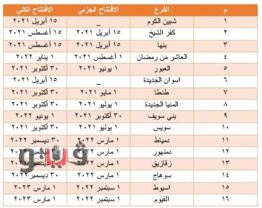 وجاء الجدول الزمنى، لمواعيد الافتتاحات للفروع فى المدن والمحافظات المختلفة، على النحو التالى: