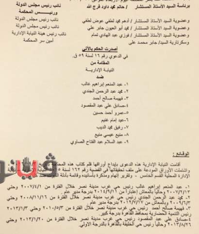جاء ذلك عبر حكم قضائي مهم في القضية رقم 16 لسنة 59 قضائية عليا بشأن قرار النيابة الإدارية بإحالة 9 مسئولين بمحافظة القاهرة بينهم 4 رؤساء أحياء للمحاكمة بعد ثبوت قيامهم بمخالفة قانون المناقصات والمزايدات والخروج على مقتضى الواجب الوظيفي وعدم أدائهم العمل المنوط بهم بدقة، مما ترتب عليه تسهيل الاستيلاء على أراضٍي الدولة وساحات السيارات بمنطقة مدينة نصر والإضرار بالمال العام.