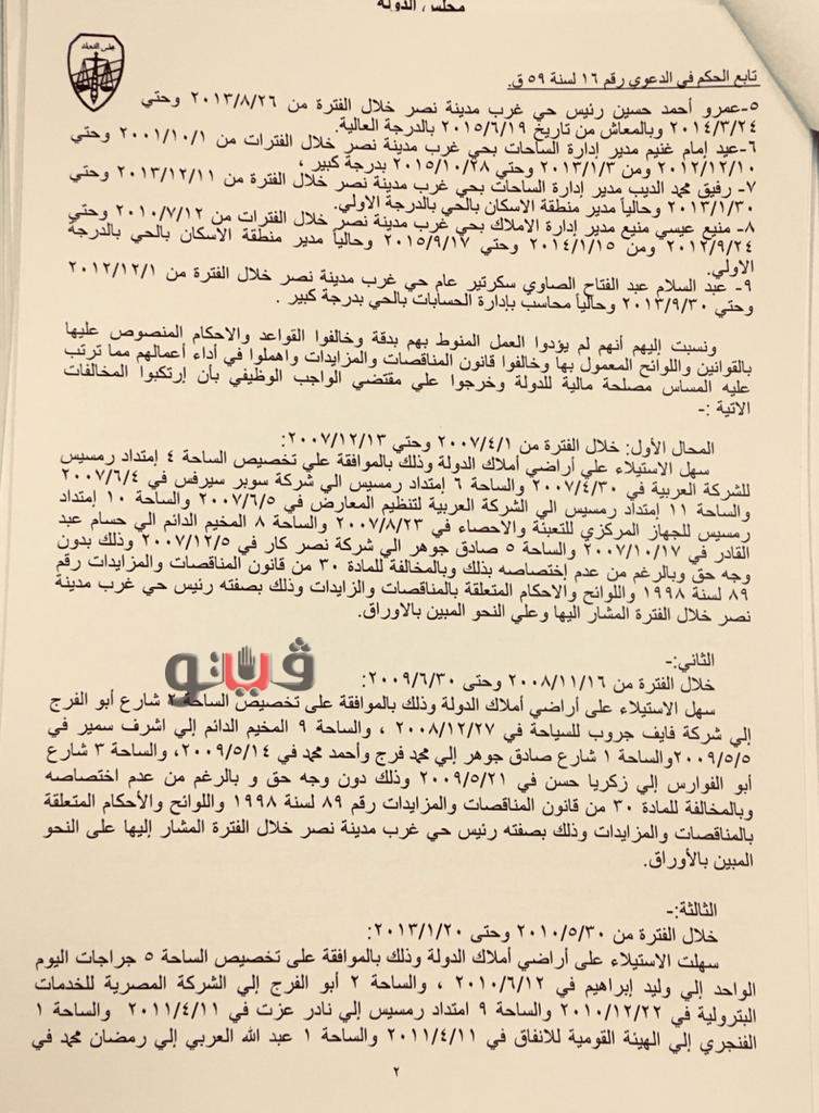 وتبين أن محمد عبدالرحمن الجندي، خلال فترة شغله وظيفة رئيس حي غرب مدينة نصر سهل الاستيلاء على أراضي من أملاك الدولة، وذلك بالموافقة على تخصيص الساحة 2 شارع أبوالفرج إلى شركة فايف جروب للسياحة، والساحة 9 المخيم الدائم إلى أشرف سمير والساحة 1 شارع صادق جوهر إلى محمد فرج وأحمد محمد والساحة 3 شارع أبو الفوارس إلى زكريا حسن دون وجه حق وبالمخالفة لقانون المناقصات والمزايدات ورغم عدم اختصاصه.