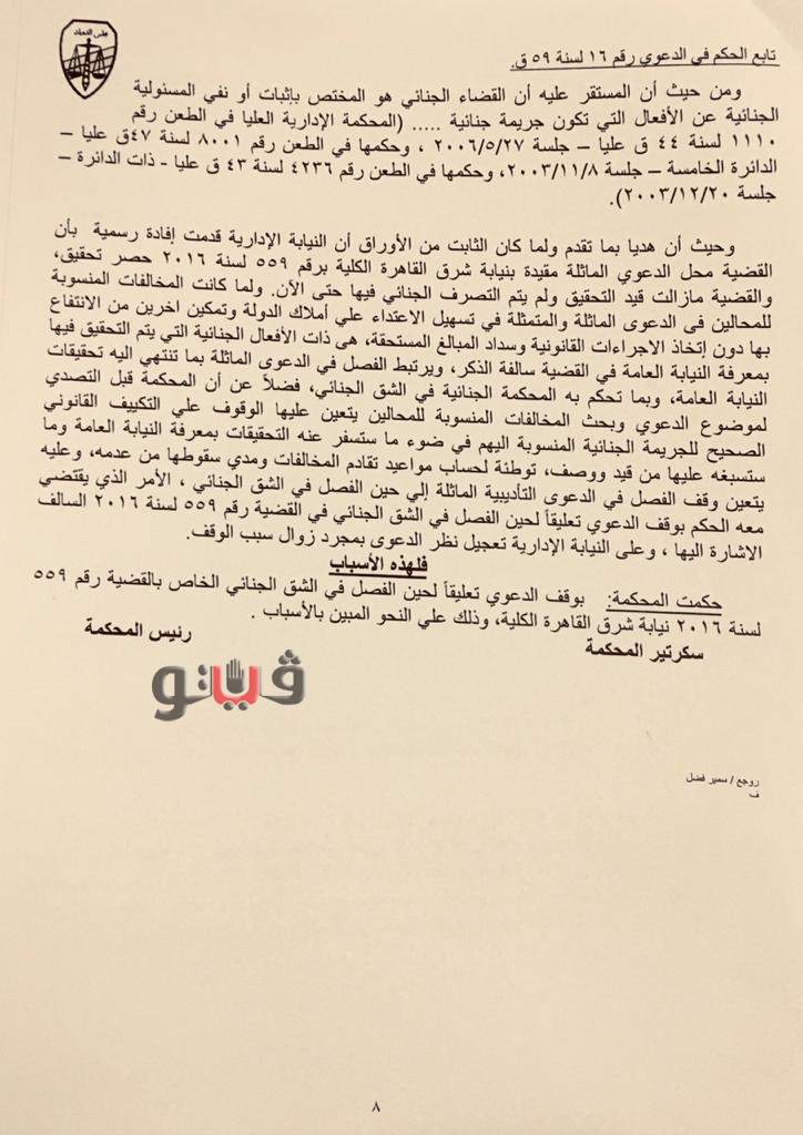 يأتي هذا فضلا عن أن المحكمة قبل التصدي لموضوع الدعوي وبحث المخالفات المنسوبة للمحالين يتعين عليها الوقوف على التكييف القانوني الصحيح للجريمة الجنائية المنسوبة إليهم في ضوء ما ستسفر عنه التحقيقات بمعرفة النيابة العامة وما ستسبغه عليها من قيد ووصف، توطئة لحساب مواعيد تقادم المخالفات ومدى سقوطها من عدمه، وعليه يتعين وقف الفصل في الدعوى التأديبية الماثلة إلي حين الفصل في الشق الجنائي، الأمر الذي يقتضي معه الحكم بوقف الدعوي تعليقاً لحين الفصل في الشق الجنائي في القضية رقم 559 لسنة 2016، فأصدرت المحكمة حكمها بوقف الدعوى تعليقًاً لحين الفصل في الشق الجنائي الخاص بالقضية رقم 559 لسنة 2016 نيابة شرق القاهرة الكلية.