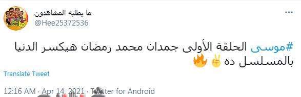 وتصدر هاشتاج "موسى" ترند "تويتر" في مصر بعد عرض الحلقة الأولى من المسلسل، وصحبها صور محمد رمضان وهو يحمل التماسيح، وعبر مغرد عن إعجابه بأعمال رمضان قائلا: "موسى الحلقة الأولى جمدان محمد رمضان هيكسر الدنيا بالمسلسل ده".