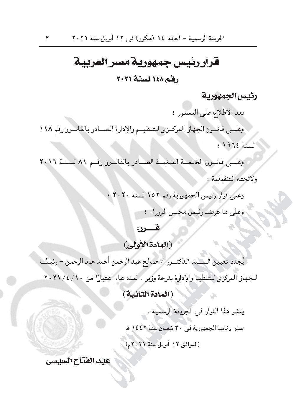 نشرت الجريدة الرسمية في عددها رقم 14 (مكرر)، الصادر في 12 أبريل 2021، قرار رئيس الجمهورية عبد الفتاح السيسي رقم 148 لسنة 2021، بشأن تجديد تعيين الدكتور صالح عبد الرحمن أحمد عبد الرحمن، رئيسًا للجهاز المركزي للتنظيم والإدارة بدرجة وزير.