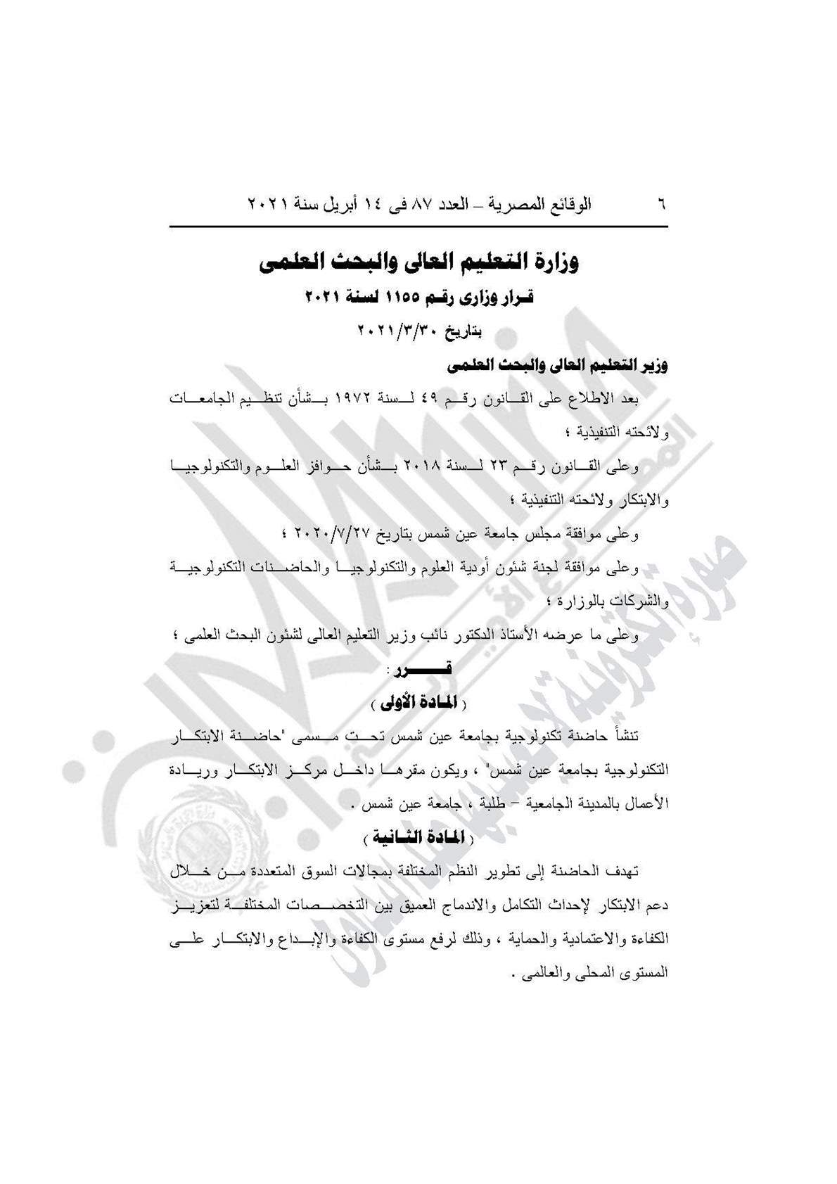 نشرت جريدة الوقائع المصرية في عددها رقم 87، الصادر في 14 أبريل 2021، قرار وزارة التعليم العالي والبحث العلمي رقم 1155 لسنة 2021، بشأن إنشاء حاضنة تكنولوجية بجامعة عين شمس تحت مسمى "حاضنة الابتكار التكنولوجية بجامعة عين شمس"، ويكون مقرها داخل مركز الابتكار وريادة الأعمال بالمدينة الجامعية - طلبة ، جامعة عين شمس.