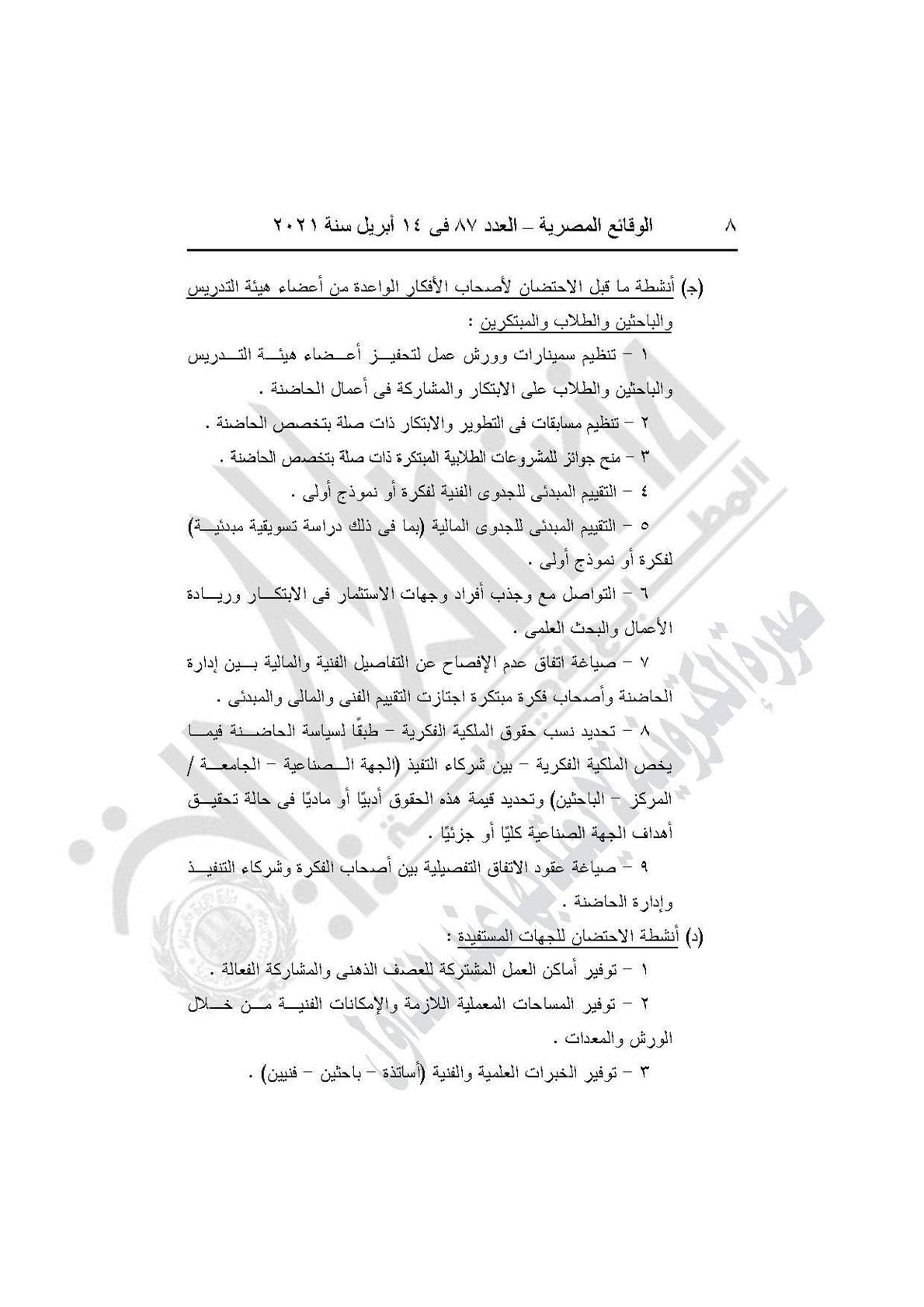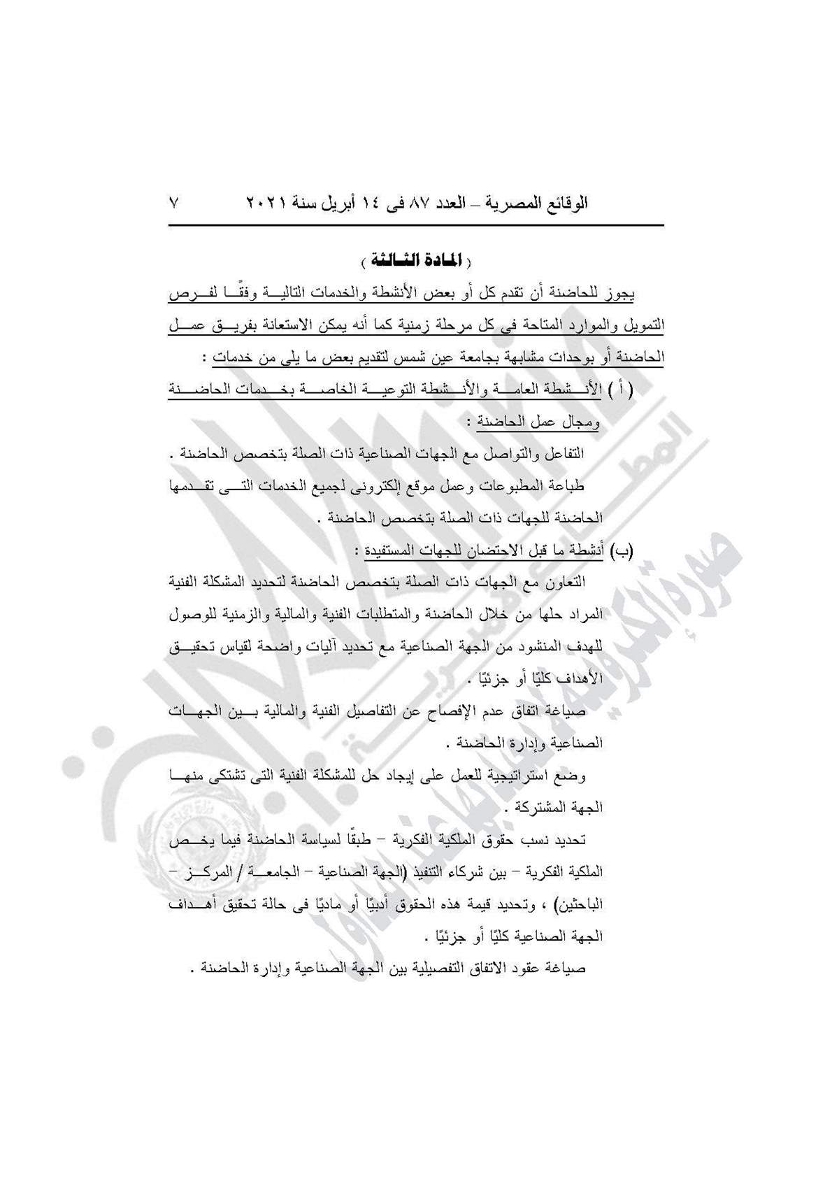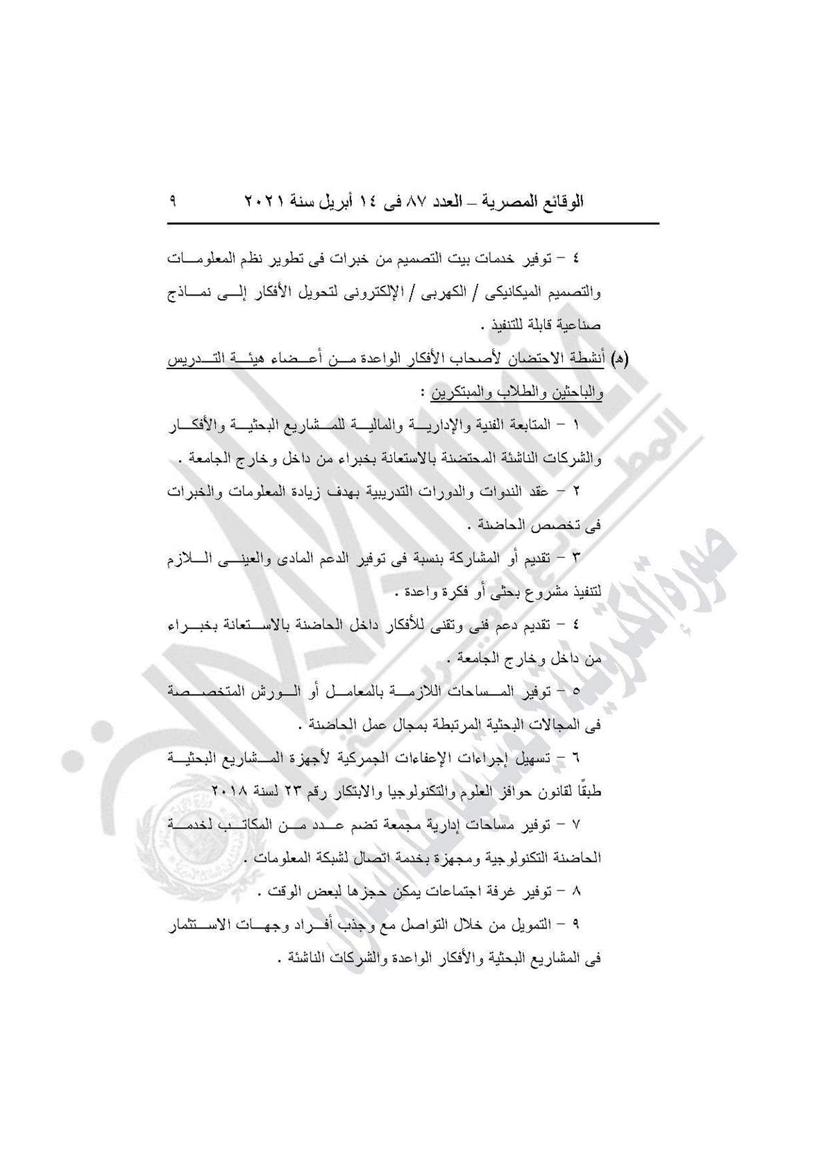 وفي المادة الثالثة يجوز للحاضنة أن تقدم كل أو بعض الأنشطة والخدمات التالية وفقًا لفرص التمويل والموارد المتاحة فى كل مرحلة زمنية، كما أنه يمكن الاستعانة بفريق عمل الحاضنة أو بوحدات مشابهة بجامعة عين شمس لتقديم (الأنشطة العامة والأنشطة التوعية الخاصة بخدمات الحاضنة).
