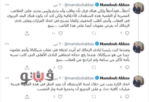 وكتب ممدوح عباس عبر حسابه الشخصي بموقع التواصل الاجتماعي «تويتر» قائلا: «اتحاد الكرة يجب من خلال لجنة الاستئناف أن يعيد النظر في هذه العقوبة فستة مباريات كافية جدا، وعلى الجميع أن يخمدوا فتنة ونار التعصب».