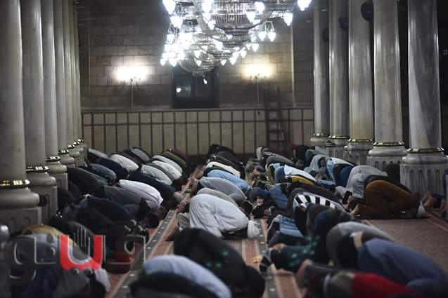 المسلمين على أداء صلاة التراويح في ثالث ليالي وثاني أيام شهر رمضان المبارك، بمسجد الحسين في