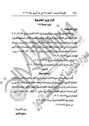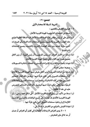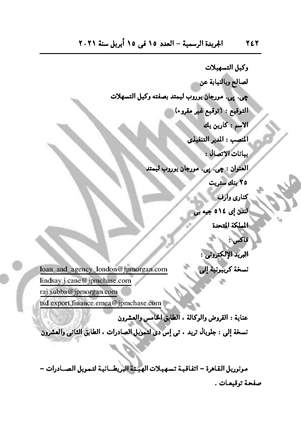 نشرت الجريدة الرسمية في عددها رقم 15، الصادر في 15 أبريل 2021، قرار الرئيس عبد الفتاح السيسي رقم 642 لسنة 2020، بشأن الموافقة على اتفاقية تسهيل قرض لأجل بين الهيئة القومية للأنفاق (بصفتها المقترض) وجي بي مورجان يورب ليمتد.