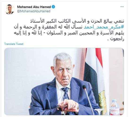 ونعاه البرلماني السابق محمد أبو حامد قائلا:"ننعي ببالغ الحزن و الآسى الكاتب الكبير الأستاذ #مكرم_محمد_احمد نسأل الله له المغفرة والرحمة وأن يلهم الأسرة والمحبين الصبر والسلوان- إنا لله و إنا إليه راجعون".