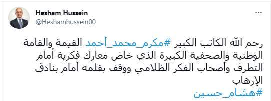 كما نعاه البرلماني هشام حسين قائلا: "رحم الله الكاتب الكبير #مكرم_محمد_أحمد القيمة والقامة الوطنية والصحفية الكبيرة الذي خاض معارك فكرية أمام التطرف وأصحاب الفكر الظلامي ووقف بقلمه أمام بنادق الإرهاب".
