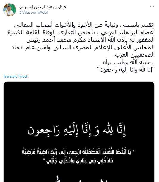 ونعاه رئيس البرلمان العربي عادل بن عبد الرحمن العسومي قائلا:" أتقدم بأسمي ونيابةً عن الأخوة والأخوات أصحاب المعالي أعضاء البرلمان العربي ، بأخلص التعازي، لوفاة القامة الكبيرة المغفور له بإذن الله الأستاذ مكرم محمد أحمد رئيس المجلس الأعلى للإعلام المصري السابق وأمين عام اتحاد الصحفيين العرب. رحمه الله وطيب ثراه "إنا لله وإنا إليه راجعون"