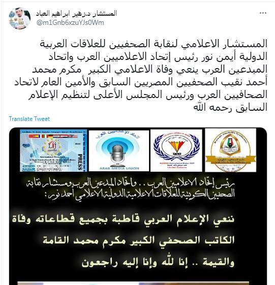 ونعاه رئيس نقابة الصحفيين الكويتية المستشار الدكتور زهير إبراهيم العباد قائلا: "المستشار الاعلامي لنقابة الصحفيين للعلاقات العربية الدولية أيمن نور رئيس إتحاد الاعلاميين العرب واتحاد المبدعين العرب ينعي وفاة الاعلامي الكبير مكرم محمد أحمد نقيب الصحفيين المصريين السابق والأمين العام لاتحاد الصحافيين العرب ورئيس المجلس الأعلى لتنظيم الإعلام السابق رحمه الله".