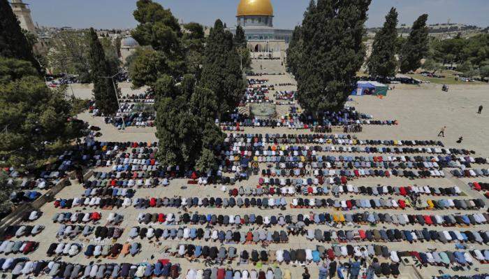 واحتشدت ساحات المسجد بالمصلين، فيما تولى حراس المسجد وفرق النظام تخصيص منطقة قبة الصخرة والساحات المحيطة لصلاة النساء والمسجد القبلي المسقوف والساحات المحيطة لصلاة الرجال.