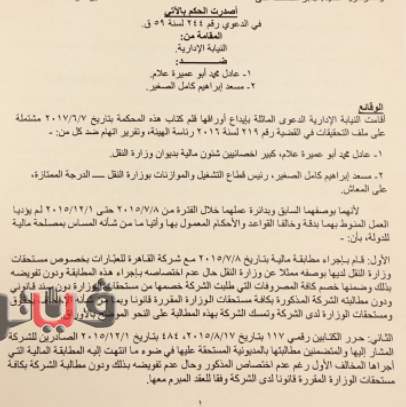 حيثيات براءة وكيل أول وزارة النقل وكبير أخصائيين من إهدار المال العام