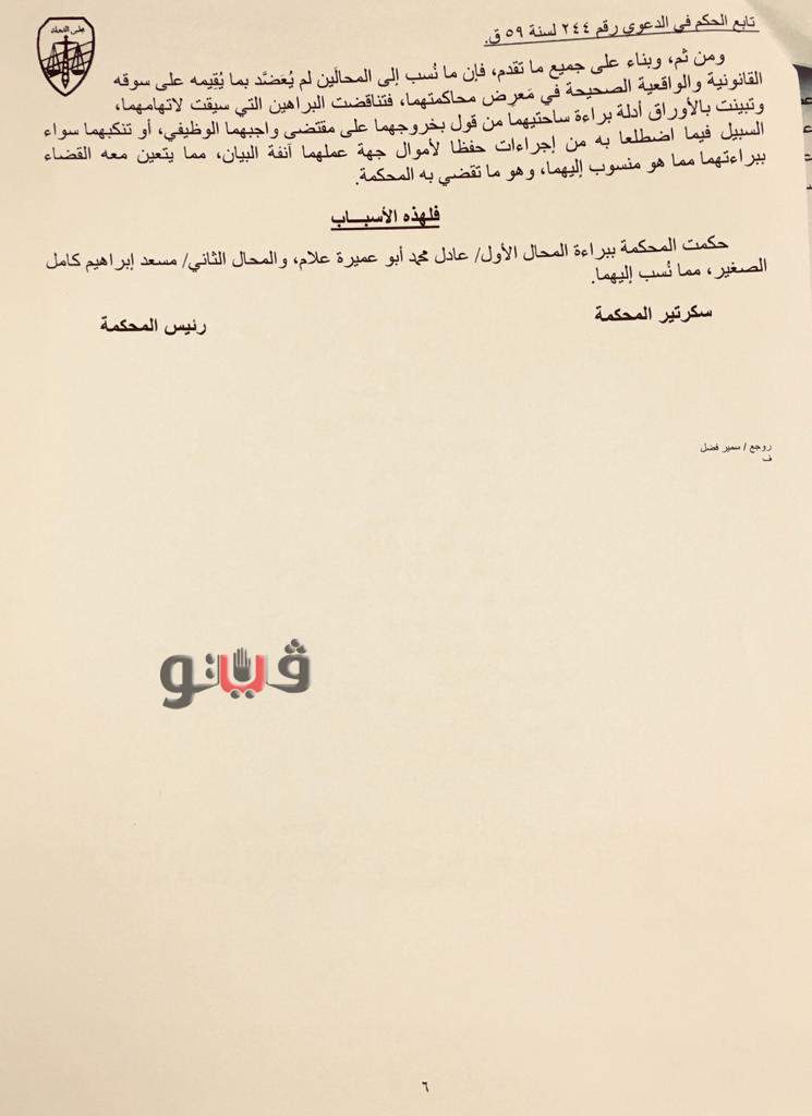 ومن ثم، فإن ما نُسب إلى المحالَين لم يُعَضَّد بما يُقِيمه على سوقه القانونية والواقعية الصحيحة في مَعرِض محاكمتهما، فتناقضت البراهين التي سيقت لاتهامهما، وتبينت بالأوراق أدلة براءة ساحتيهما من قول بخروجهما على مقتضى واجبهما الوظيفي، أو تنكبهما سواء السبيل فيما اضطلعا به من إجراءات حفظا لأموال جهة عملهما آنفة البيان، مما يتعين معه القضاء ببراءتهما مما هو منسوب إليهما، وهو ما تقضي به المحكمة، ولذلك قضت ببراءة المحال الأول عادل محمد علام، ومسعد إبراهيم كامل، مما نُسب إليهم