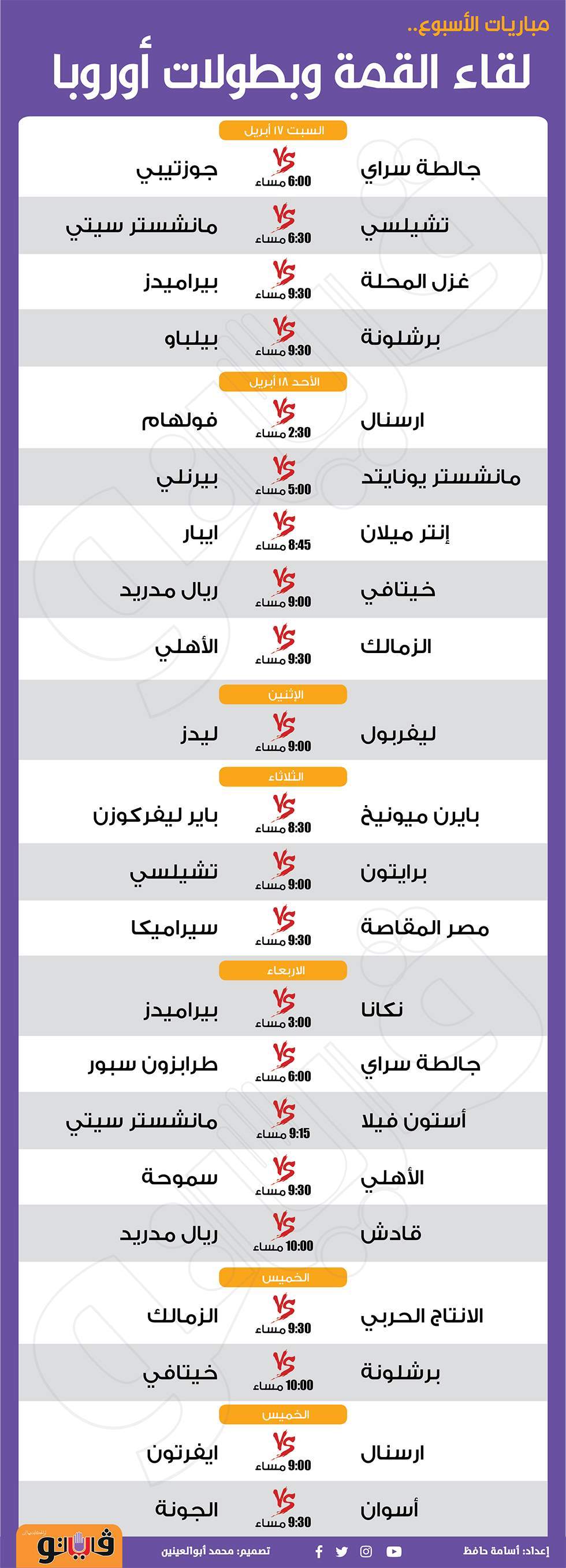 مباريات الأسبوع.. لقاء القمة وبطولات أوروبا السبت 17/أبريل/2021 - 05:08 م 4/17/2021 5:08:52 PM الاهلي والزمالك أسامة حافظ شارك طباعة 18 حجم الخط شارك طباعة موعد مباراة الاهلي والزمالك لقاء القمة مواعيد مباريات الأسبوع