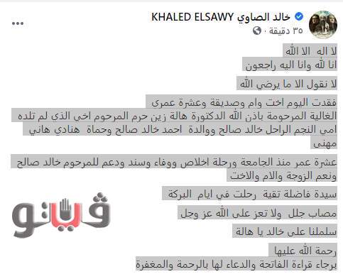 وأضاف: "رحلت في أيام البركة.. مصاب جلل ولا تعز على الله عز وجل.. سلملنا على خالد يا هالة برجاء قراءة الفاتحة والدعاء لها بالرحمة والمغفرة".