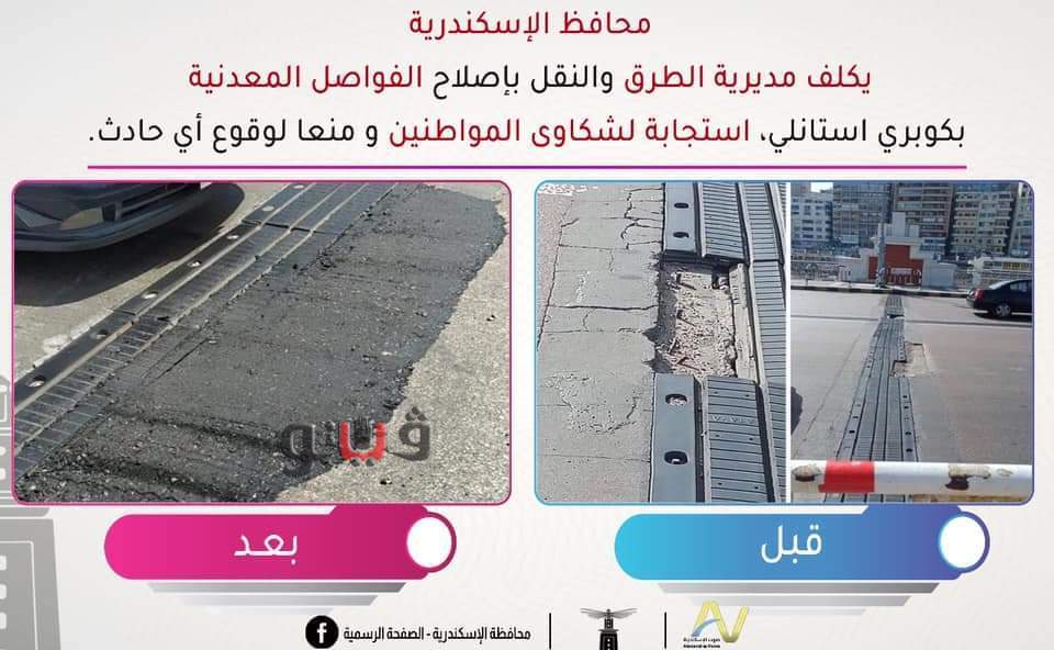 كلف محافظ الإسكندرية اللواء محمد الشريف، مديرية الطرق بإصلاح فواصل كوبري ستانلي بشكل مؤقت لحين الانتهاء من استلام الفواصل الحديدية وتركيبها بمعرفة جهاز تنمية الساحل الشمالي .