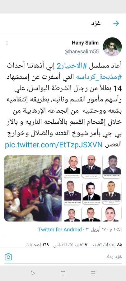واعتبر أحد المغردين أن مسلسل #الاختيار 2 أعاد إلى أذهاننا أحداث #مذبحة_كرداسة التي أسفرت عن استشهاد 14 بطلًا من رجال الشرطة البواسل، على رأسهم مأمور القسم ونائبه، بطريقة انتقامية بشعة ووحشية من الجماعة الإرهابية من خلال اقتحام القسم بالأسلحة النارية وبالآر بي جي، بأمر شيوخ الفتنة والضلال وخوارج العصر.