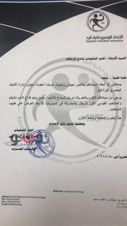 تلقى مسئولو نادي الزمالك خطابا من اتحاد كرة اليد، يتضمن قرارا بمنع لاعب الفريق حسن وليد قداح، من خوض أي مواجهات قبل عرضه على طبيب المنتخب الوطني.