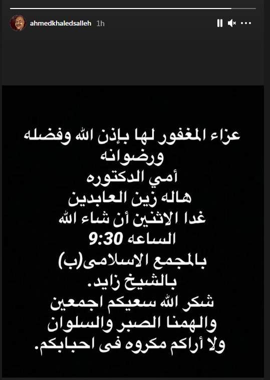 وكتب أحمد خالد صالح عبر خاصيه الاستوري قائلا: " عزاء المغفور لها بإذن الله وفضله ورضوانه امي الدكتورة هالة زين العابدين غدأ الاثنين ان شاء الله الساعة 9:30 بالمجمع الاسلامي "ب" بالشيخ زايد شكر الله سعيكم جمعيا ويلهمنا الصبر والسلوان ولا أراكم مكروه في أحبابكم".