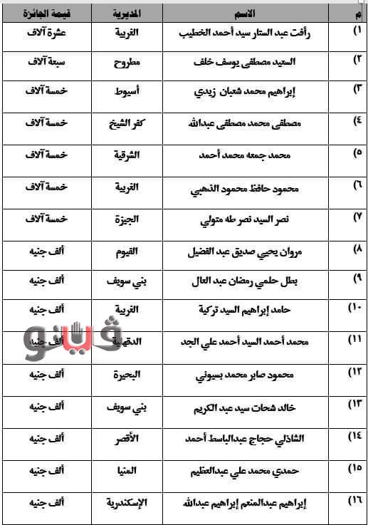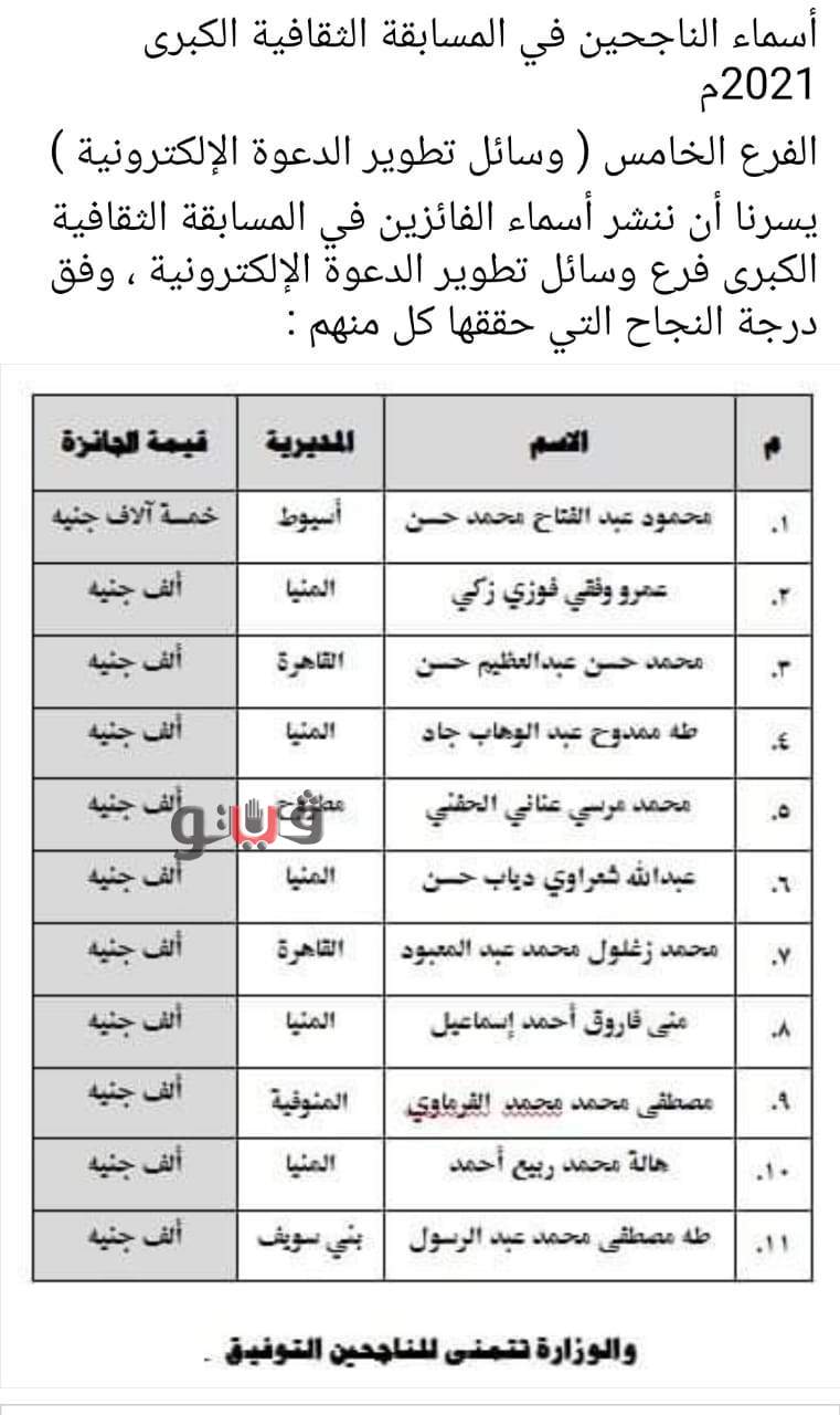 أعلنت وزارة الأوقاف، اليوم الأحد، عن أسماء الفائزين بجائزة المسابقة الثقافية الكبرى.
