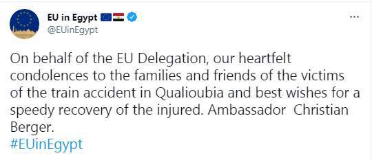 وكتب الحساب الرسمي للاتحاد الأوروبي في مصر على تويتر "بالنيابة عن وفد الاتحاد الأوروبي في مصر، نعرب عن خالص تعازينا لأسر وأصدقاء ضحايا حادث القطار في القليوبية، وأطيب التمنيات بالشفاء العاجل للمصابين. السفير كريستيان برجر".