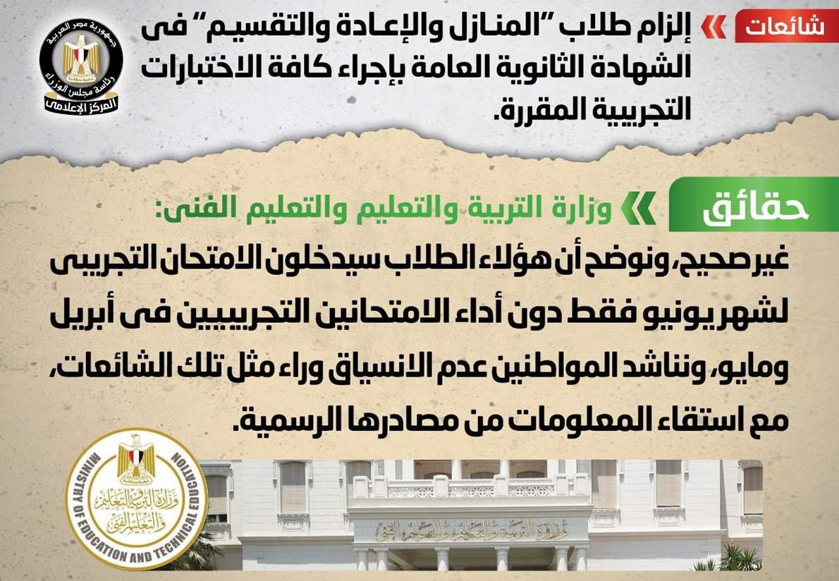 وتواصل المركز الإعلامي لمجلس الوزراء مع وزارة التربية والتعليم والتعليم الفني، والتي نفت تلك الأنباء، مُؤكدةً أنه لا صحة لإلزام طلاب "المنازل والإعادة والتقسيم" في الشهادة الثانوية العامة بإجراء كافة الاختبارات التجريبية المقررة.