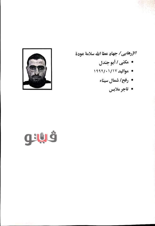 وتم تحديد اثنين من العناصر الارهابيه التي لقيت مصرعهم وهما القيادي الارهابي محمد زيادة سالم زيادة حركي عمار والذي يعد من اخطر العناصر الارهابية وتولي الاعداد والتخطيط والتنفيذ للعديد من الحوادث الإرهابية التي شهدتها محافظة شمال سيناء.