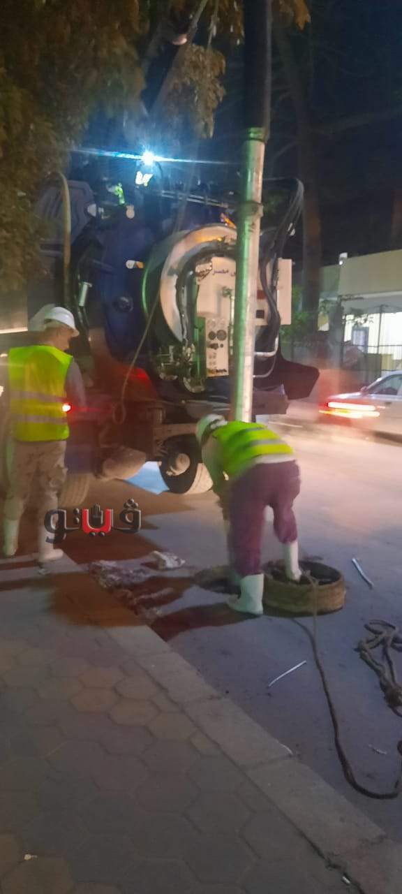 المعنية بمحافظة الجيزة من تطهير شبكة الصرف الصحي بشارع ربيع الجيزى.