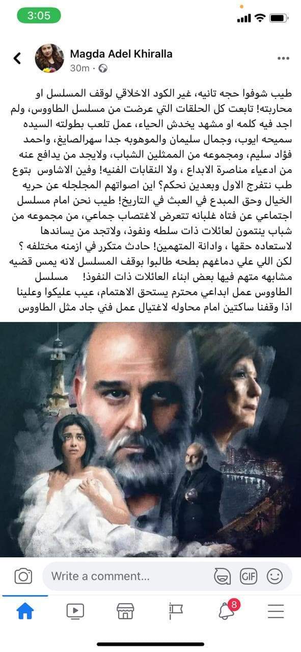 واختتمت حديثها قائلة:" مسلسل الطاووس عمل إبداعي محترم يستحق الاهتمام، عيب عليكوا وعلينا إذا وقفنا ساكتين أمام محاولة لاغتيال عمل فني جاد مثل الطاووس".
