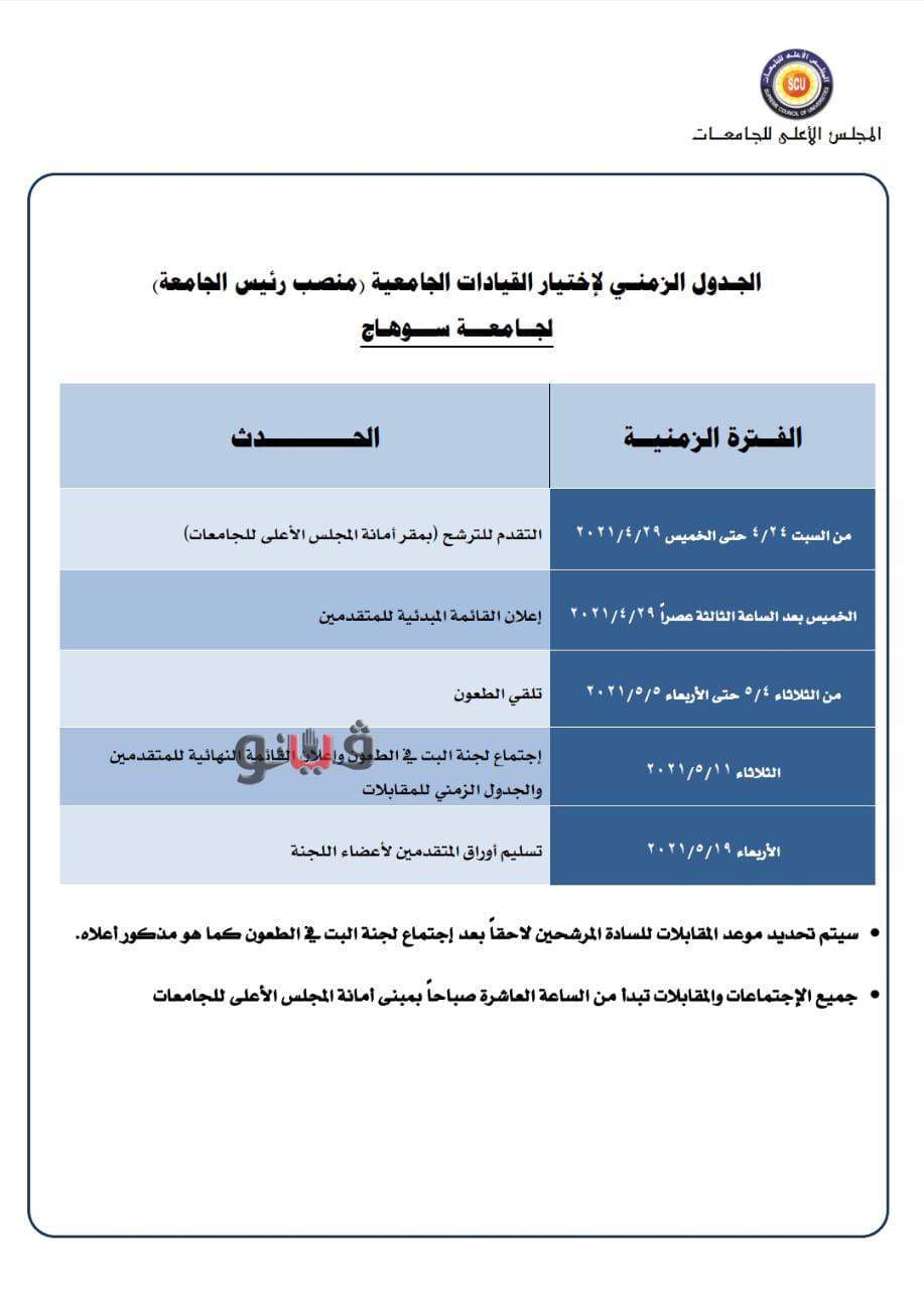 جامعة سوهاج تعلن الجدول الزمني للترشح لمنصب "رئيس الجامعة"