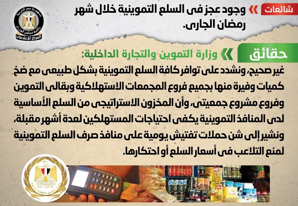 وتواصل المركز الإعلامي لمجلس الوزراء مع وزارة التموين والتجارة الداخلية، والتي نفت تلك الأنباء، مُؤكدةً أنه لا صحة لوجود عجز في أي من السلع التموينية خلال شهر رمضان الجاري.