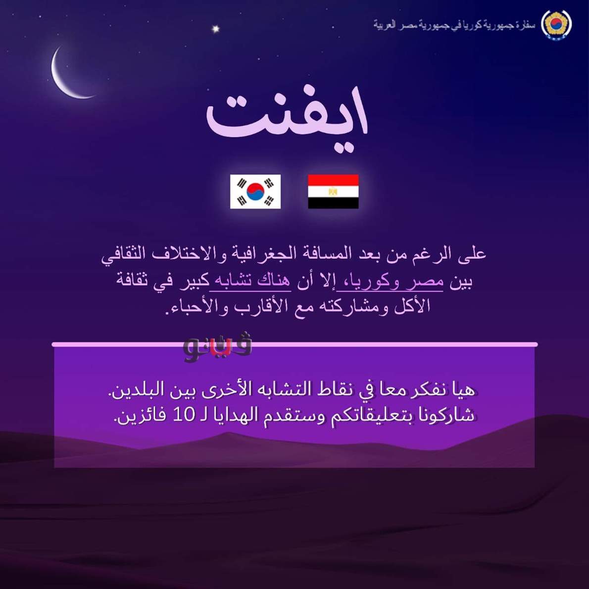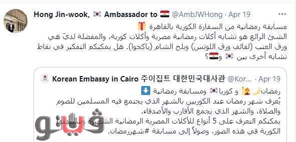 نشر السفير الكوري بالقاهرة هونج جين ووك تغريدة جديدة على موقع توتير حول أوجه التشابه بين الأطعمة المصرية المميزة لشهر رمضان والأطعمة الكورية المخصصة للاحتفالات التقليدية في كوريا الجنوبية.
