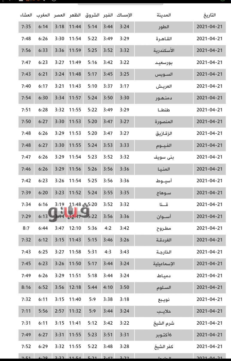 ويوضح الجدول مواقيت الصلاة اليوم كالتالي:،
