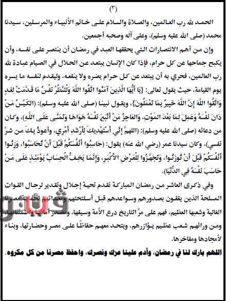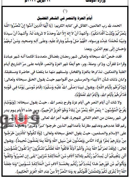 نشرت وزارة الأوقاف موضوع خطبة الجمعة القادمة، اليوم الثلاثاء عبر موقعها الرسمي أوقاف أون لاين" تحت عنوان ” أيام العزة والنصر في الشهر الفضيل”.