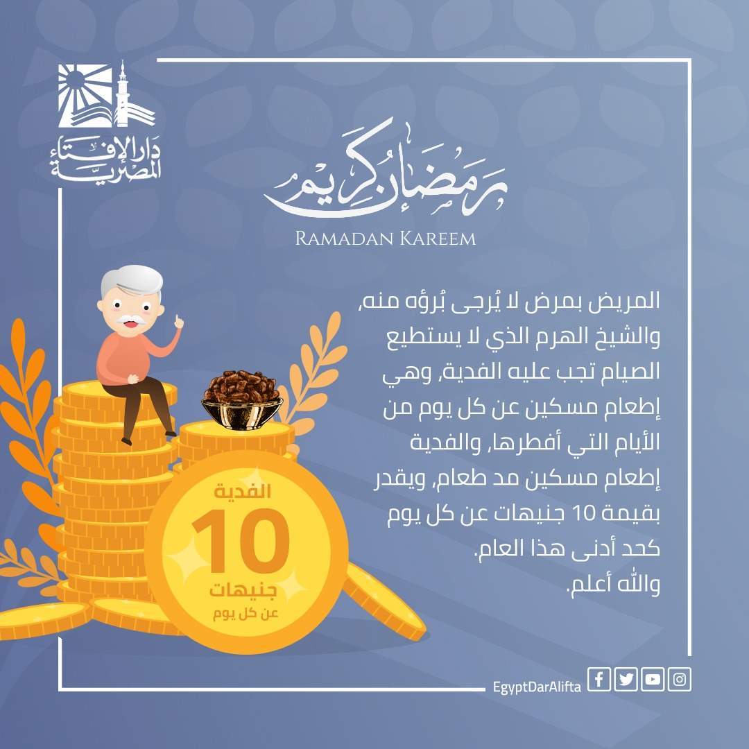 وأشارت دار الإفتاء من خلال فتوى لها، أن فدية المريض الذي لا يستطيع الصيام، هي إطعام مسكين من طعام يقدر بمبلغ 10 جنيهات عن كل يوم كحد أدنى في هذا العام.