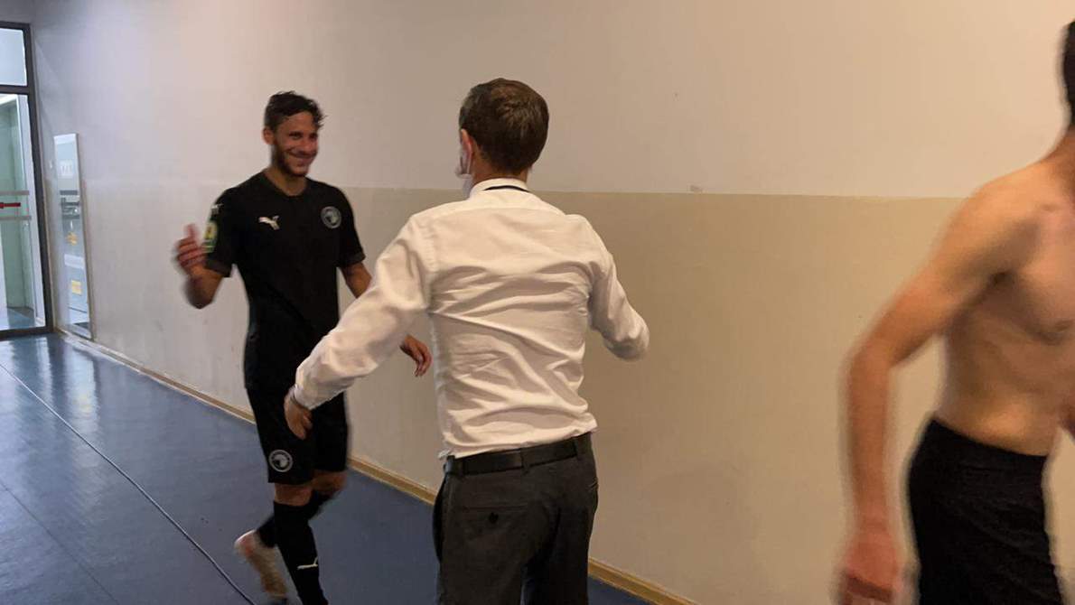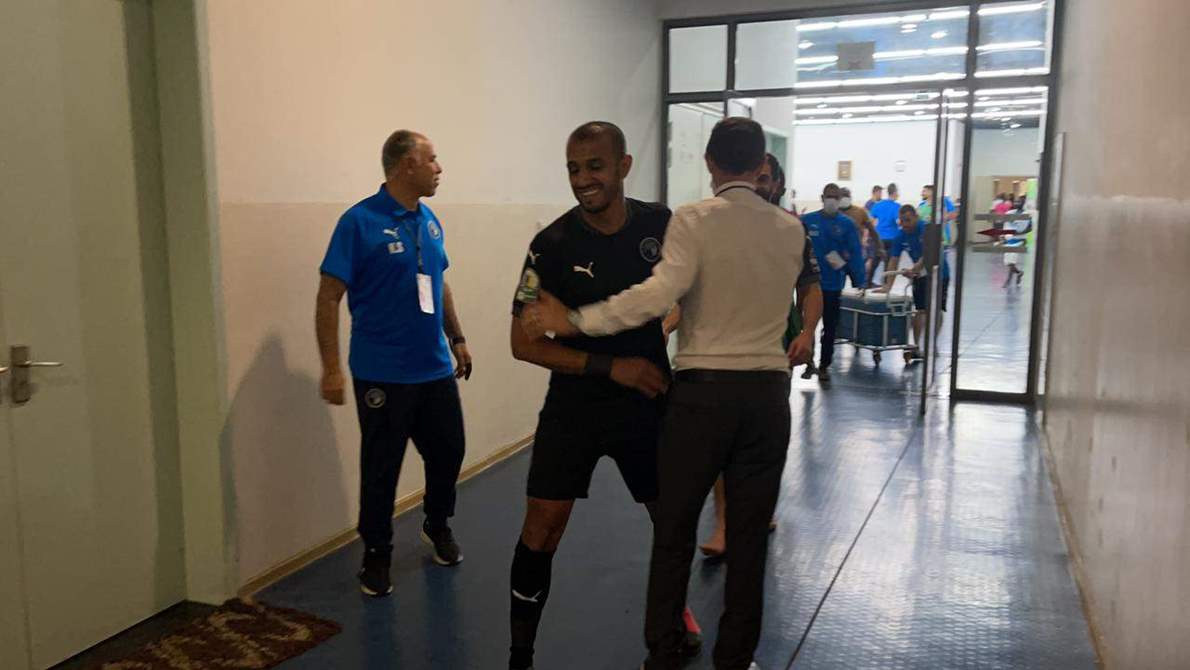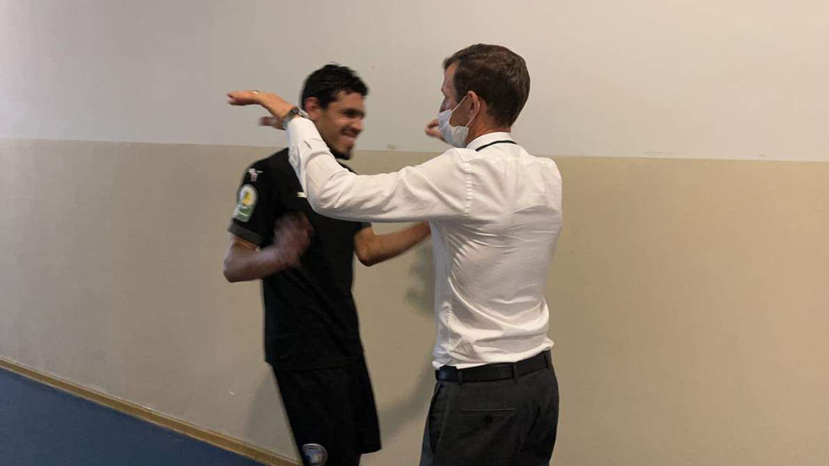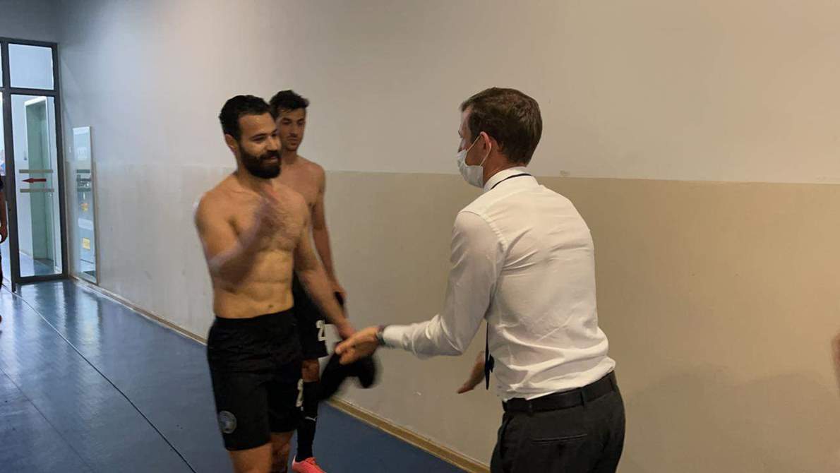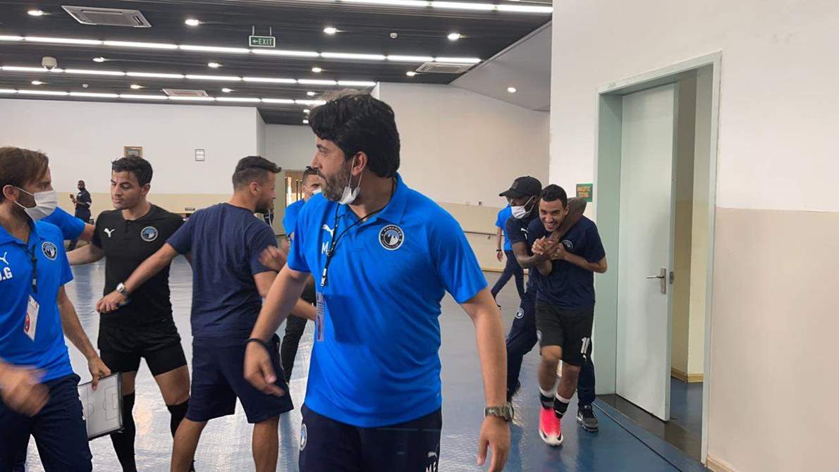 تبادل الأرجنتيني اروابارينا المدير الفنى لفريق بيراميدز التهنئة والاحضان مع اللاعبين عقب إطلاق الحكم صافرة النهاية وأثناء دخول اللاعبين غرفة خلع الملابس.