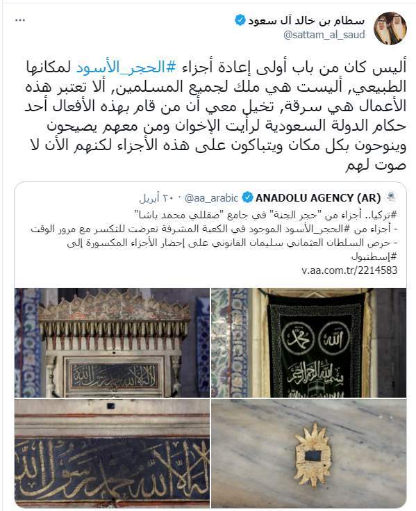 من ناحيته رد الأمير السعودي البارز سطام بن خالد آل سعود علي الادعاءات التركية عبر حسابه بموقع التواصل الإجتماعي " تويتر" برسالة غاضبة قال فيها : أليس كان من باب أولى إعادة أجزاء الحجر الأسود لمكانها الطبيعي، أليست هي ملك لجميع المسلمين.