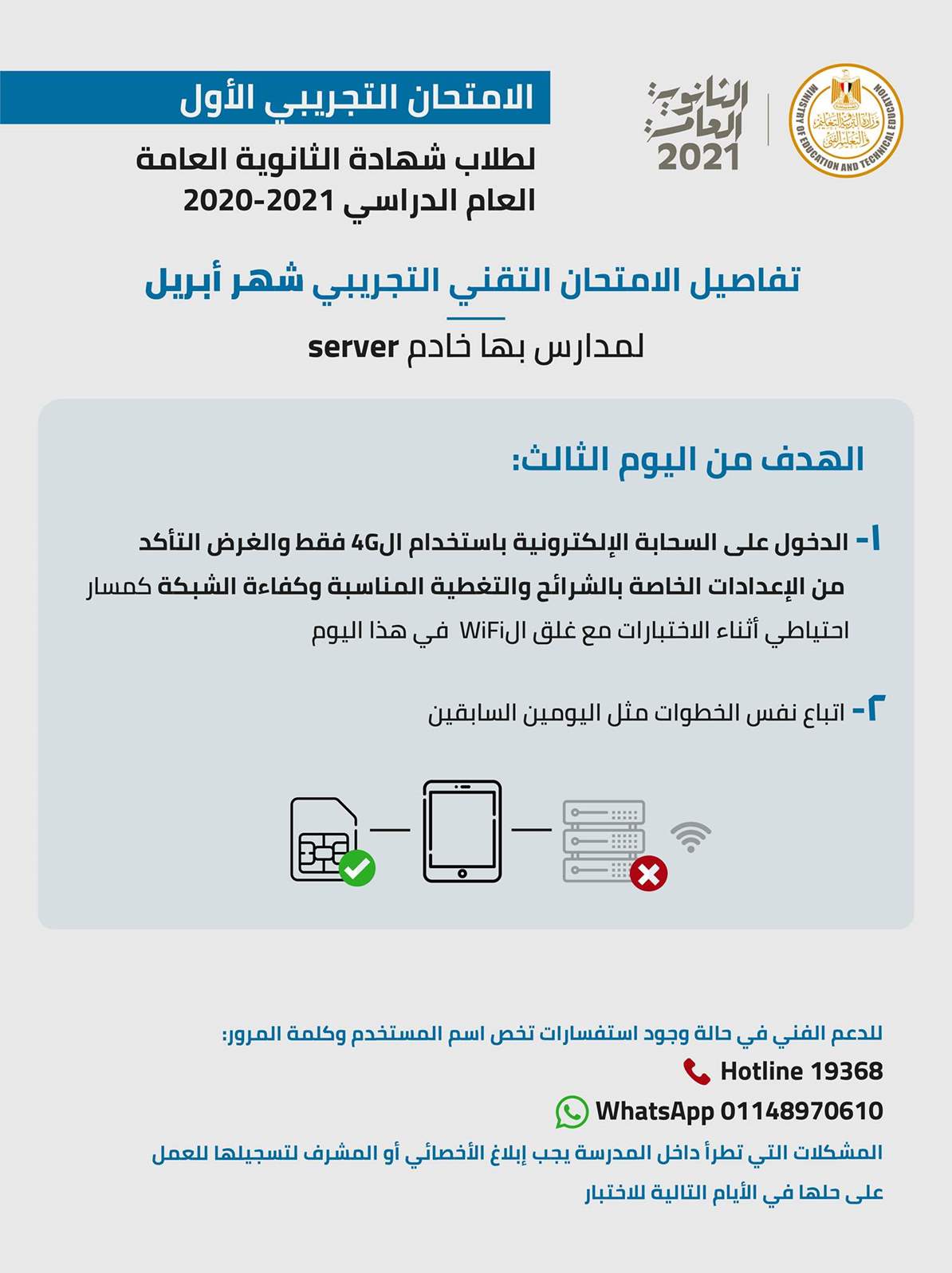 وقال وزير التربية والتعليم والتعليم الفنى في منشور له عبر صفحته الشخصية على موقع التواصل الاجتماعي فيس بوك :"اليوم الثالث غدا للامتحان التجريبي الاول للثانوية العامة يخص ايضا طلاب المدارس الحكومية اللتي بها خوادم وشبكة انترنت عن طريق الفايبر حيث يتم اختبار سعة هذه الشبكات فقط".