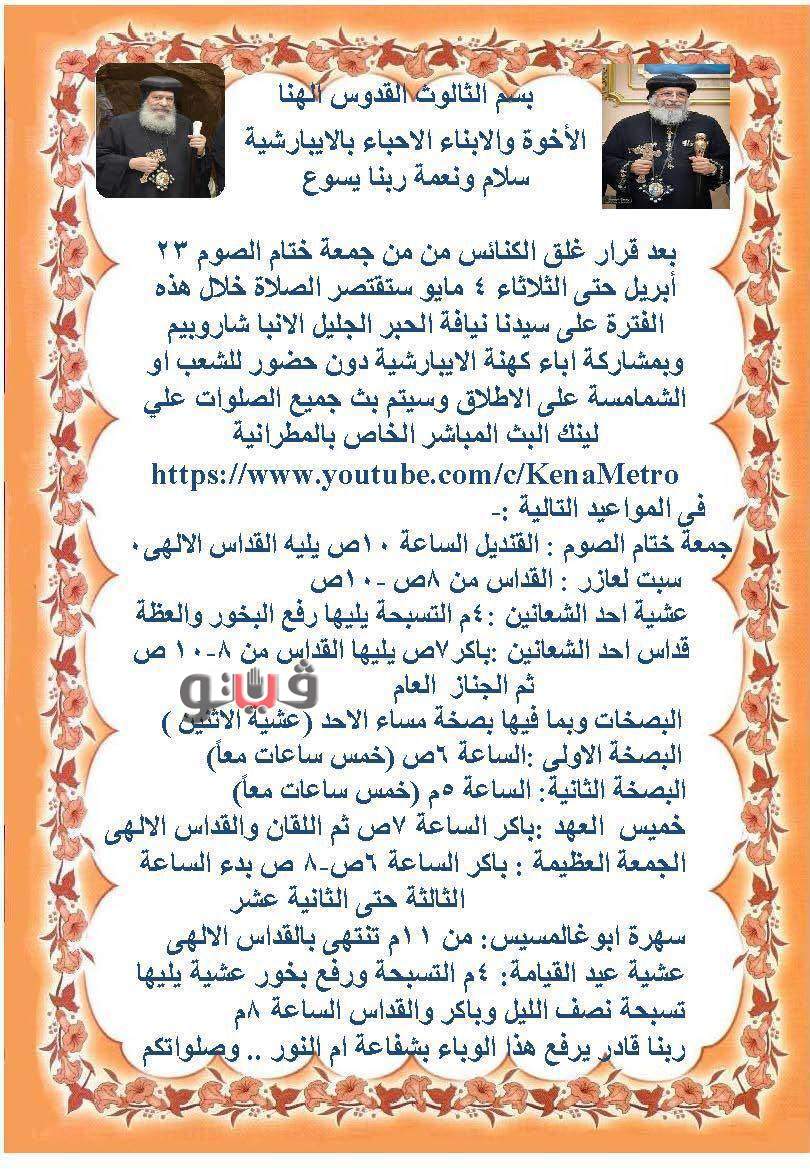وفي سياق متصل أعلنت مطرانية الأقباط الأرثوذكس بقنا وقفط وتوابعهما، وقف جميع القداسات وجميع الأنشطة الاحتفالية للأعياد الكبري القادمة بدءا من جمعة ختام الصوم 23 ابريل حتي الثلاثاء 4 مايو ويتم تقيم نسبة الاصابات من جديد.