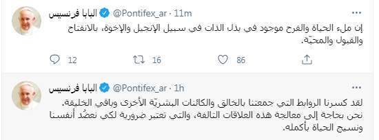 وكتب البابا فرنسيس تغريدة على تويتر قال فيها: "لقد كسرنا الروابط التي جمعتنا بالخالق والكائنات البشريّة الأخرى وباقي الخليقة. نحن بحاجة إلى معالجة هذه العلاقات التالفة، والتي تعتبر ضرورية لكي نعضُد أنفسنا ونسيج الحياة بأكمله".