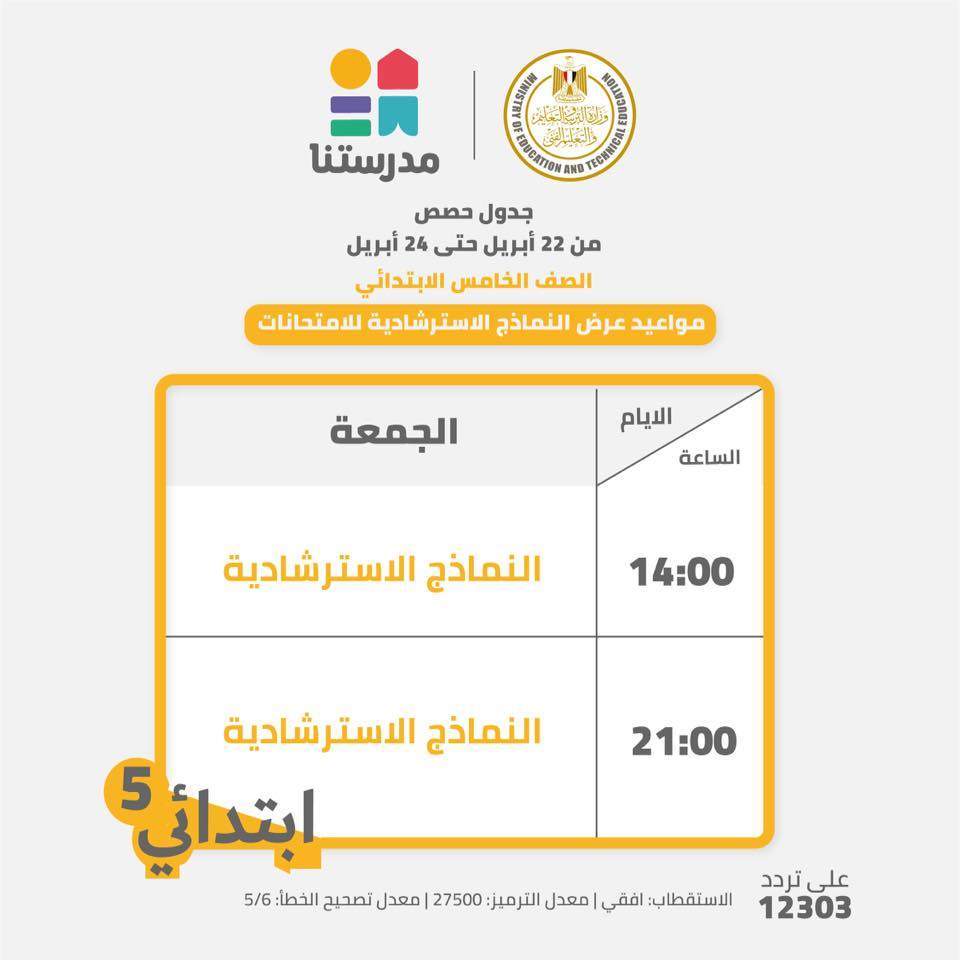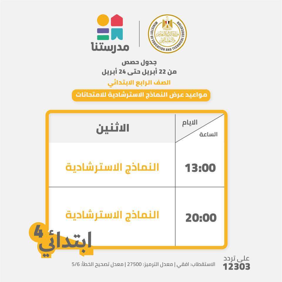 أعلنت وزارة التربية والتعليم والتعليم الفنى، مواعيد عرض النماذج الاسترشادية للامتحانات المجمعة للصفوف من الرابع الابتدائي حتى الثاني الإعدادي على القناة التعليمية "مدرستنا".. تردد: ١٢٣٠٣ أفقي / معدل الترميز: ٢٧٥٠ / معامل تصحيح الخطأ: ٥/٦.