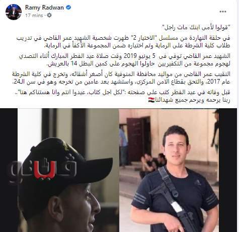 نعى الإعلامى رامى رضوان الضابط عمر القاضى، الذى استشهد فى كمين البطل 14 بالعريش، وظهرت شخصيته ضمن أحداث حلقة اليوم فى مسلسل الاختيار 2.