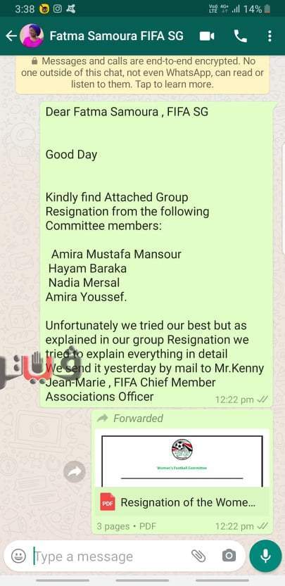 وجاء في الاستقالة أن السبب عدم منح لجنة الكرة النسائية أي اختصاصات واضحة رغم أن دورها منصوص عليه وفقا للائحة النظام الأساسي في الاتحاد بتاريخ 2017.