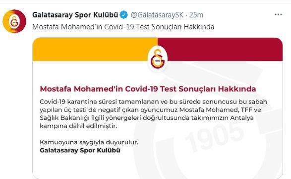 وأصدر جالطة سراي بيانا رسميا يوضح فيه نتائج الاختبارات التى أجراها اللاعب وجاء البيان: "تم تضمين لاعبنا مصطفى محمد الذى انتهت فترة الحجر الصحي الخاصة به لـ Covid-19".
